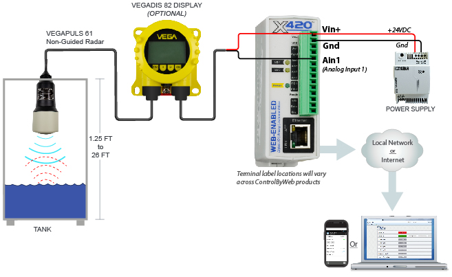 Connect the VEGADIS 82 directly to a 4-20mA sensor and the X-420 to locally and remotely monitor tank levels without a cloud. Receive text/email alerts when a user-specified level is reached. Log and graph a tank’s level data over time.