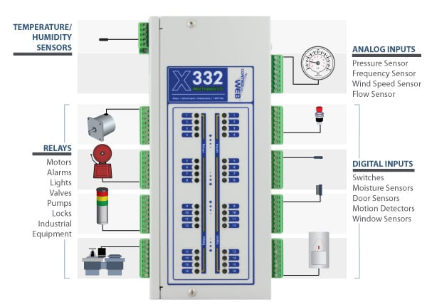 X-332 | 16 relays, 16 digital inputs, 4 analog inputs, 2 counter inputs, up to 4 temperature/humidity sensors, and a built-in web-server. Allows remote access from many devices along with infinite control and monitoring possibilities.
